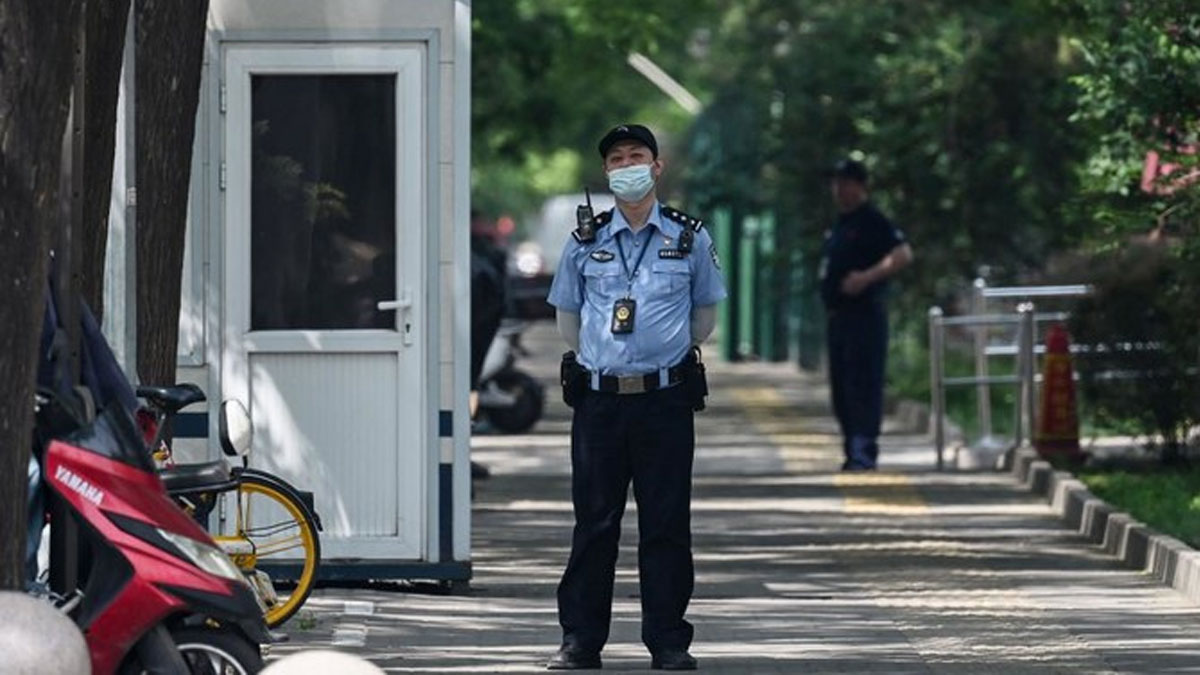 চীনের রাজধানী বেইজিংয়ে কানাডিয়ান দূতাবাসের বাইরে দাঁড়িয়ে আছেন এক পুলিশ কর্মকর্তা। মঙ্গলবারের ছবি