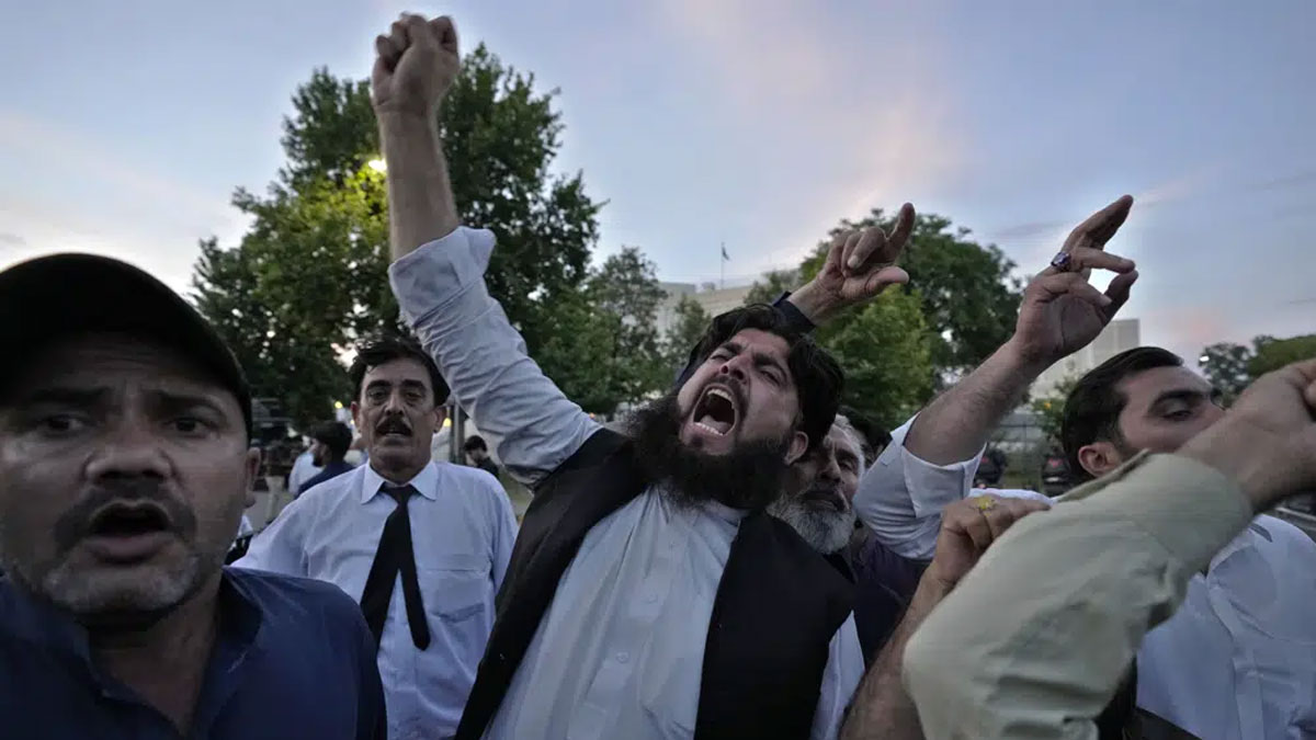 পাকিস্তানের সুপ্রিম কোর্টের বাইরে স্লোগান দিচ্ছেন ইমরান খানের সমর্থকরা। বৃহস্পতিবারের ছবি