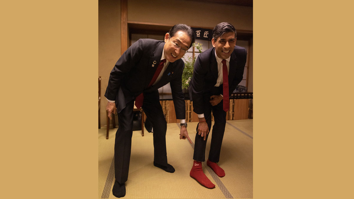 জাপানে পৌঁছানোর পর বৃহস্পতিবার (১৮ মে) রাতে দেশটির প্রধানমন্ত্রী ফুমিও কিশিদার সঙ্গে নৈশভোজে অংশ নেন সুনাক। সেখানেই জাপানি প্রধানমন্ত্রীর সঙ্গে একটি ছবি তোলেন তিনি। ছবিটিতে দেখা যায়— তিনি একটি লাল মোজা পরে আছেন। আর সেই মোজার দিকে হাতের আঙ্গুল দিয়ে ইঙ্গিত করছেন কিশিদা। এ সময় দুইজনই হাসছিলেন।