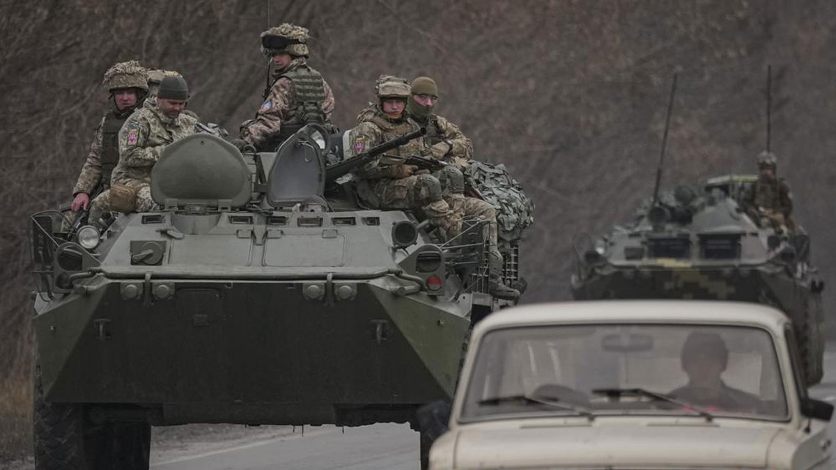 গত বছরের ফেব্রুয়ারিতে ট্যাংক বহর নিয়ে এগিয়ে যাচ্ছেন ইউক্রেনীয় সেনারা