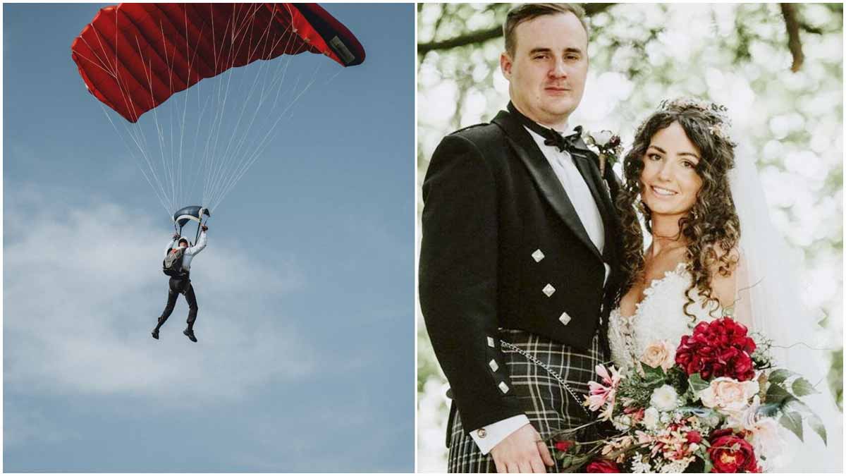 স্ত্রীকে চমক দিতে জেমস বন্ড-স্টাইলে স্কাইডাইভে উড়ে বিয়ের আসরে হাজির হয়েছেন আফগান যুদ্ধে পা হারানো ব্রিটিশ এক সৈন্য। ১৪ শতকে নির্মিত এক দুর্গে বিয়ের আসরে বরের সঙ্গে তার আরও ৯ বন্ধুও স্কাইডাইভে উড়ে একে একে নামেন। অভিনব উপায়ে বিয়ের আসরে বর ও তার বন্ধুদের হাজির হওয়ার ভিডিও সামাজিক যোগাযোগমাধ্যমে মুহূর্তের মধ্যে ভাইরাল হয়ে যায়।