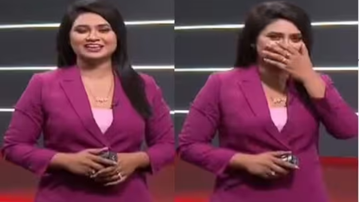 ভারতের বিহারের বন্যার খবর পড়তে গিয়ে হঠাৎ করেই হেসে ফেলেন সঞ্চালিকা এবং তিনি কিছুতেই হাসি থামাতে পারেন না।