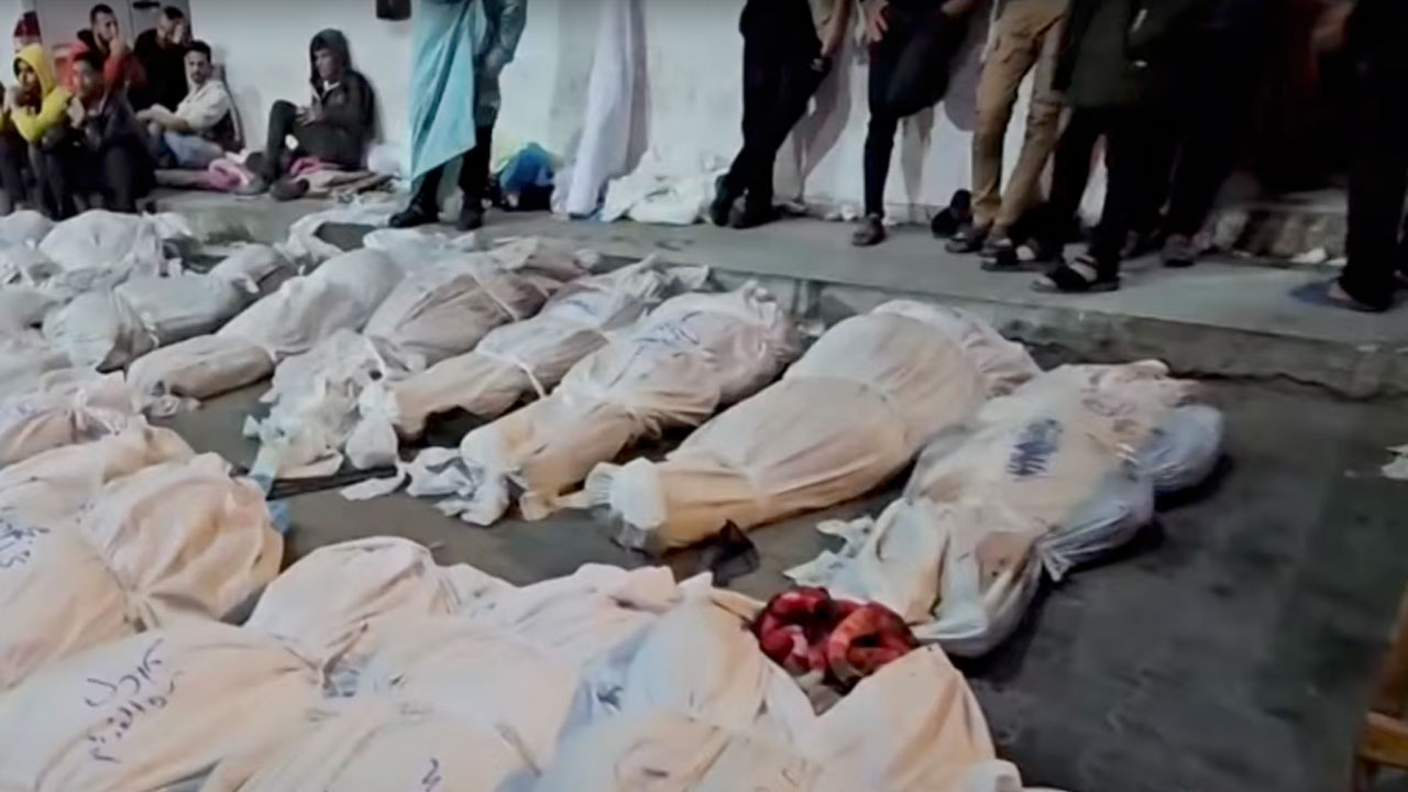 ইসরায়েলি হামলায় নিহতদের মৃতদেহ গাজার একটি মেডিকেল কম্পাউন্ডের উঠানে সারিবদ্ধভাবে রাখা হয়েছে