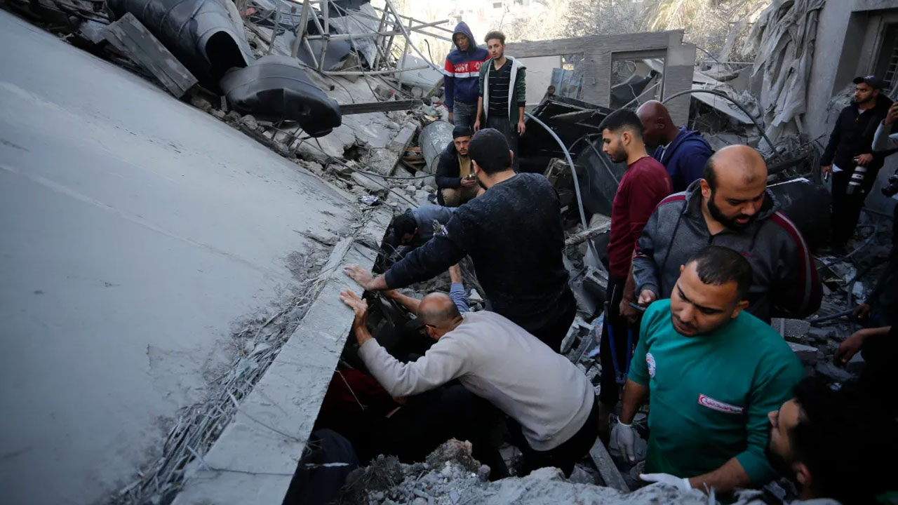 গাজার দেইর আল-বালাহে ইসরায়েলি হামলার পর ধ্বংসপ্রাপ্ত ভবনের ধ্বংসস্তূপের নিচে বেঁচে থাকা মানুষ এবং মৃতদেহের সন্ধান করছেন স্থানীয়রা