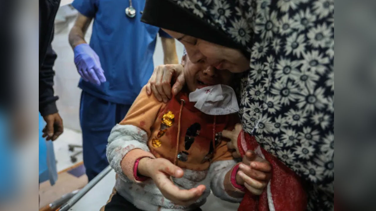 গাজায় ইসরায়েলি বিমান হামলায় আহত এক ফিলিস্তিনি শিশু চিকিৎসার জন্য খান ইউনিস শহরের নাসের হাসপাতালে পৌঁছেছে