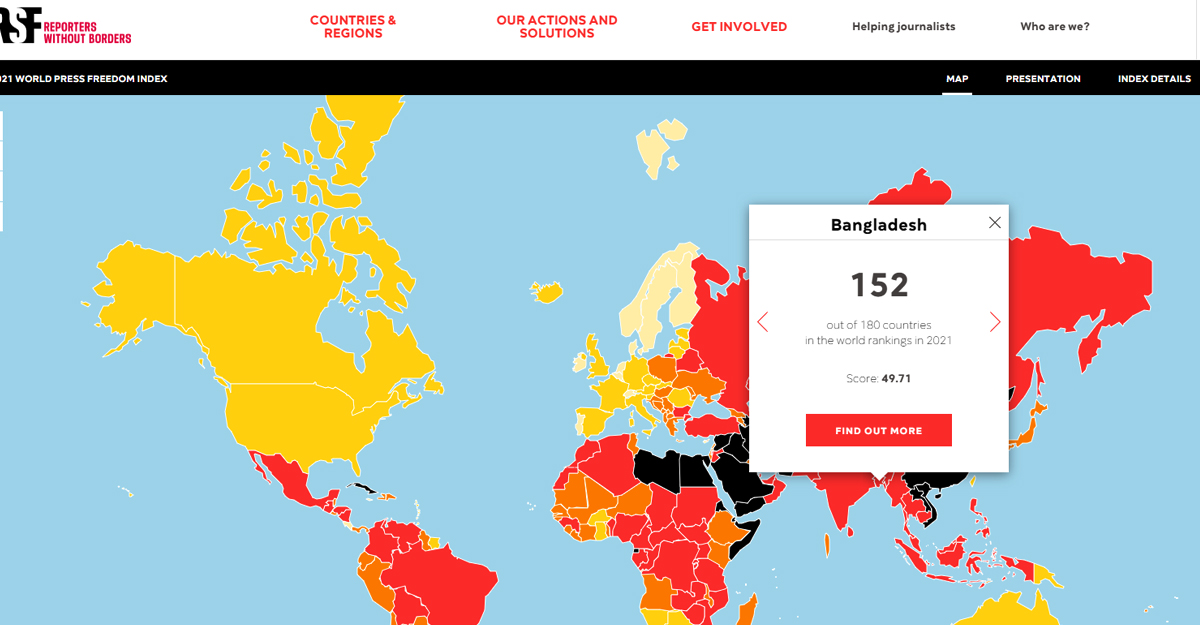 মঙ্গলবার প্রকাশিত আরএসএফের প্রতিবেদনে বলা হয়েছে, বিশ্বের ১৮০টি দেশের মধ্যে ২০২১ সালে বাংলাদেশের অবস্থান ১৫২তম। গত বছর এই সূচকে বাংলাদেশের অবস্থান ১৫১তম ছিল। তার আগের বছর অর্থাৎ ২০১৯ সালে বাংলাদেশের এই অবস্থান ছিল ১৫০তম। এ নিয়ে টানা দুই বছর বাংলাদেশের অবস্থানের অবনতি ঘটলো।