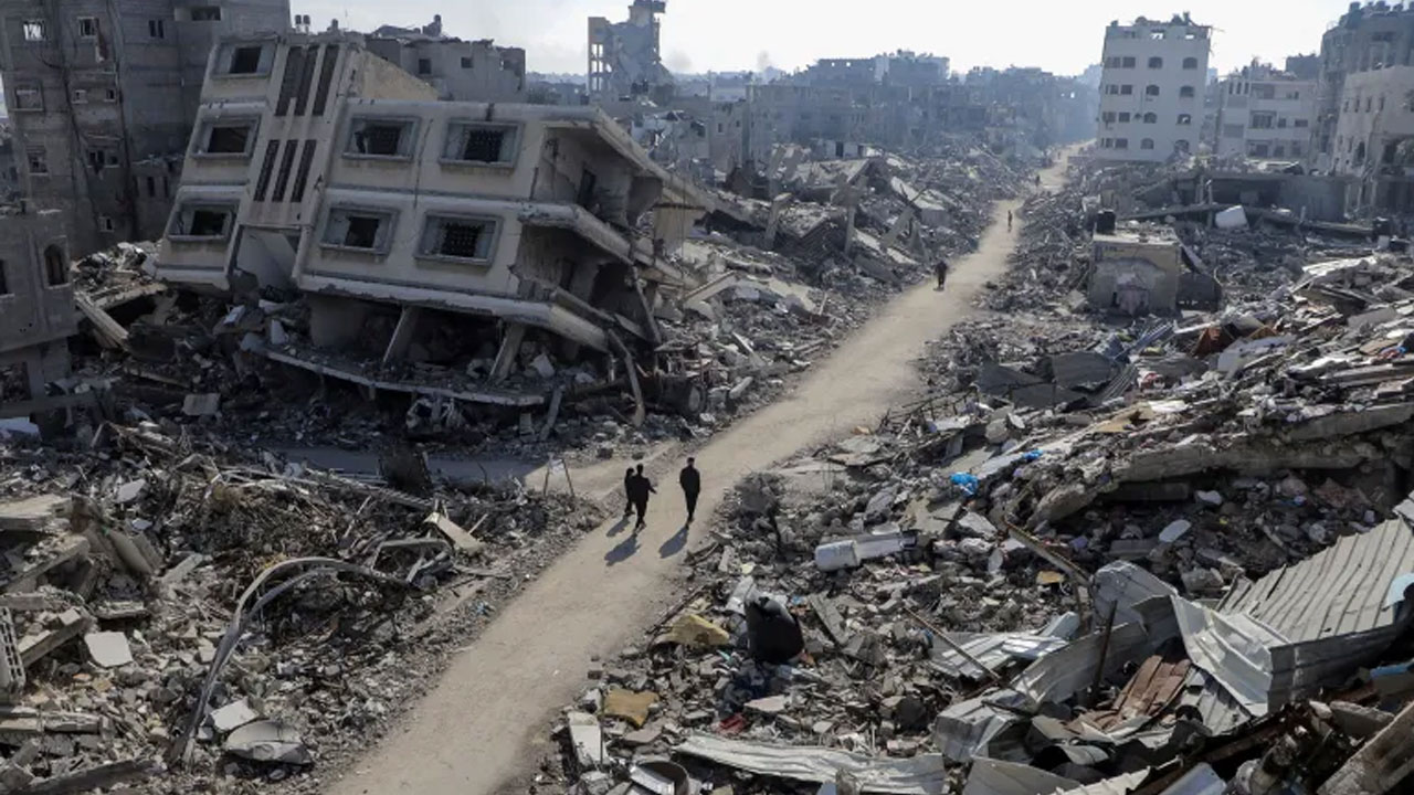 উত্তর গাজা উপত্যকায় ধ্বংস হওয়া বাড়ির পাশ দিয়ে হেঁটে যাচ্ছেন ফিলিস্তিনিরা। বৃহস্পতিবারের ছবি