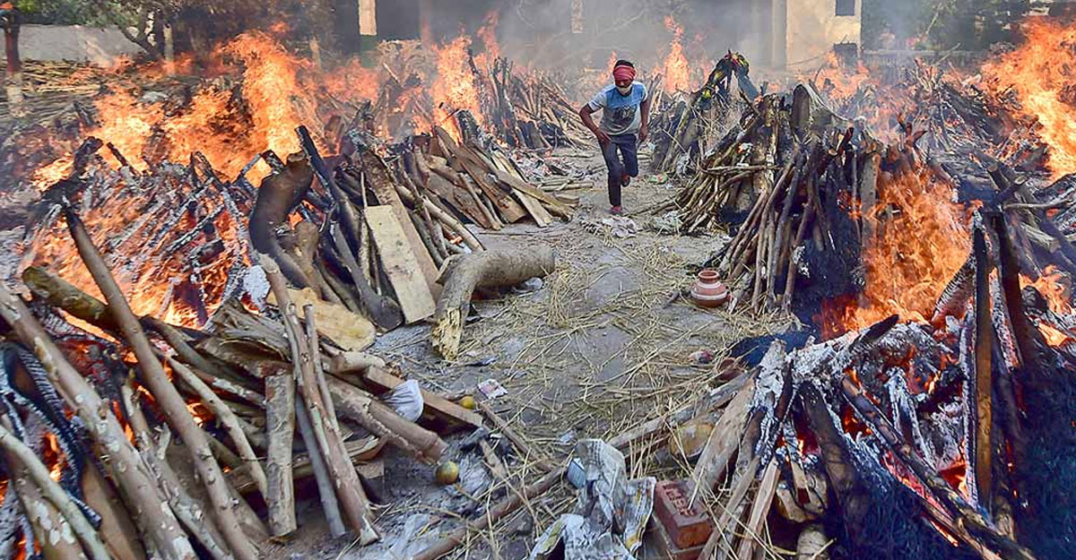 করোনা মহামারির দ্বিতীয় ঢেউয়ে ভারতের রাজধানী নয়াদিল্লির যা পরিস্থিতি দাঁড়িয়েছে, তা বর্ণনাতীত। সারা দেশের মতো রাজধানী নয়াদিল্লিতে মৃত্যুর সংখ্যা যেমন লাফিয়ে লাফিয়ে বাড়ছে তাতে যেন ফুরিয়ে যাচ্ছে মৃতদেহ দাহ করার কাঠ। মিলছে না সৎকারের লোকও। সোমবার (২৬ এপ্রিল) শহরের গাজিপুরের এক শ্মশানে দেখা গেল করোনায় মারা যাওয়া ব্যক্তিদের দাহ করতে জ্বলছে গণচিতা। এ যেন পুরো ভারতেরই প্রতিচ্ছবি।