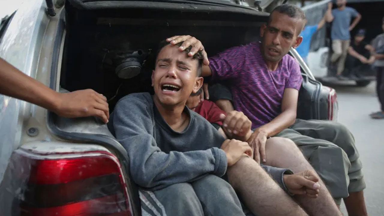 ইসরায়েলের বোমা হামলায় নিহত আত্মীয়দের জন্য দক্ষিণ গাজার খান ইউনিসের একটি হাসপাতালে কান্নায় ভেঙে পড়েছে এক ফিলিস্তিনি কিশোর। সোমবারের ছবি