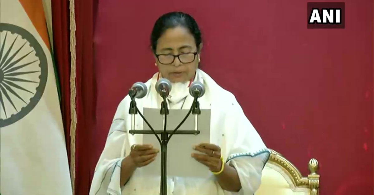 ভারতীয় সংবাদমাধ্যমগুলো বলছে, বুধবার স্থানীয় সময় সকাল সোয়া দশটার দিকে তৃতীয় বারের জন্য মুখ্যমন্ত্রী পদে শপথ নিতে কলকাতায় নিজের কালীঘাটের বাড়ি থেকে বের হন মমতা। বরাবরের মতো এসময় তিনি সাদা শাড়ি এবং হাওয়াই চপল পরে ছিলেন। পরে সাড়ে ১০টার দিকে তিনি রাজভবনে পৌঁছে যান। সেখানেই মমতাকে শপথ বাক্য পাঠ করান রাজ্যপাল জগদীপ ধনখড়।