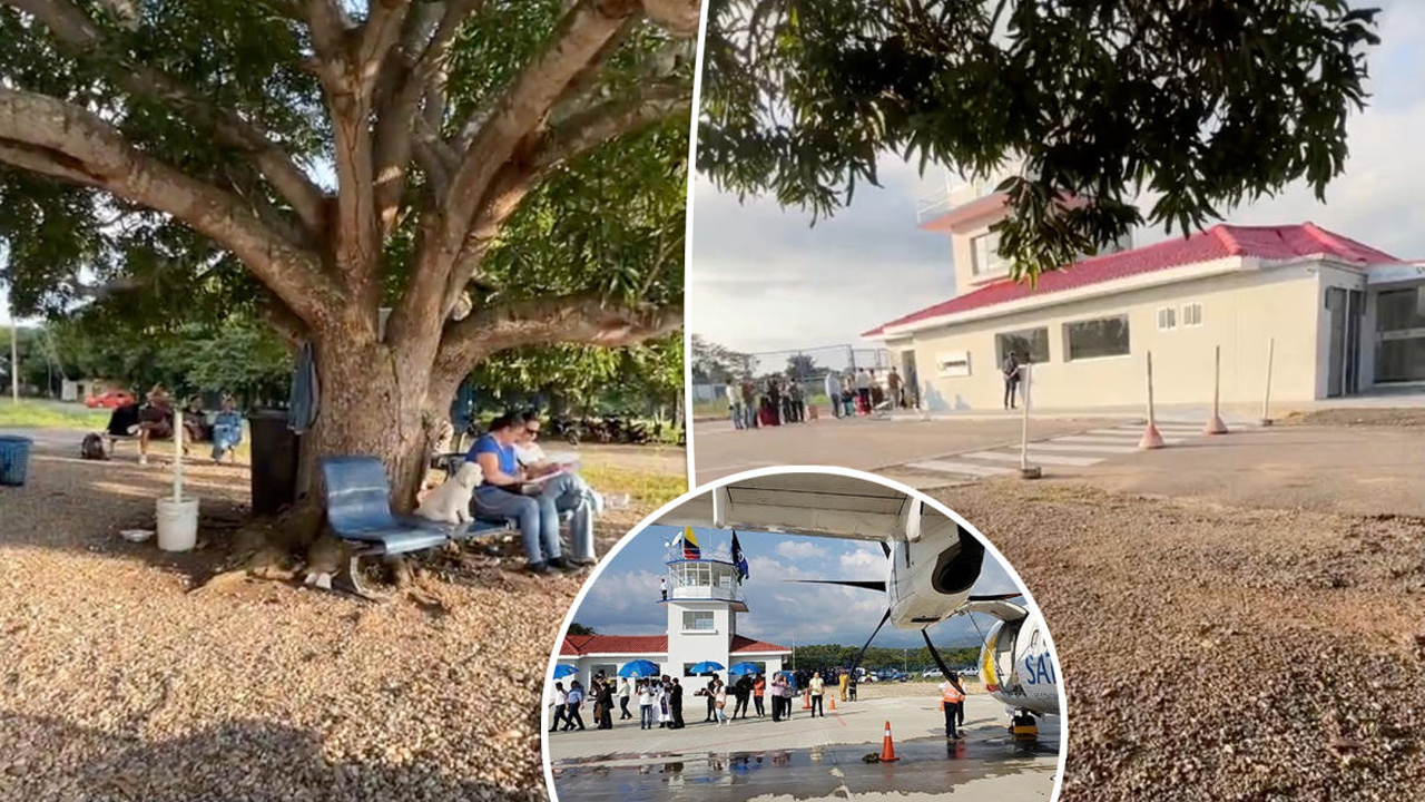 ট্রাভেল কলম্বিয়া নামের একটি হ্যান্ডেল থেকে এই বিমানবন্দরের ছবি পোস্ট করা হয়েছে সোশ্যাল মিডিয়ায়। একনজরে দেখলে বিমানবন্দর বলে বোঝার উপায় নেই। গাছের নিচে চেয়ার পাতা। সেটাই ওয়েটিং এরিয়া। রোদের মধ্যেই যাত্রীরা অপেক্ষা করছেন।