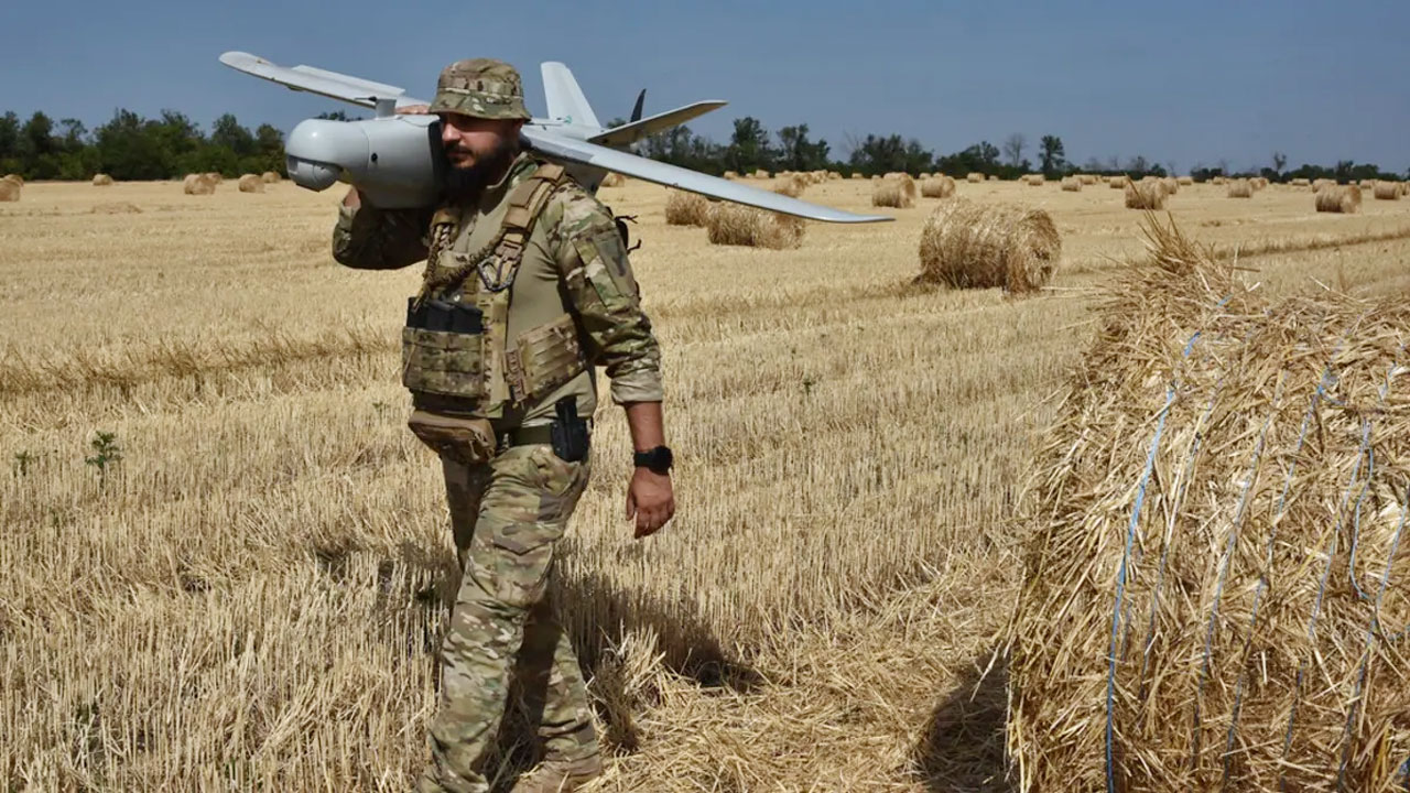 ইউক্রেনের জাপোরিঝিয়া অঞ্চলে ফ্রন্ট লাইনের কাছে গম ক্ষেতে রিকনেসান্স ড্রোন লেলেকা বহন করছেন ইউক্রেনের ন্যাশনাল গার্ডের একজন সৈনিক। ছবিটি ২০২৪ সালের ২৯ জুলাই তোলা