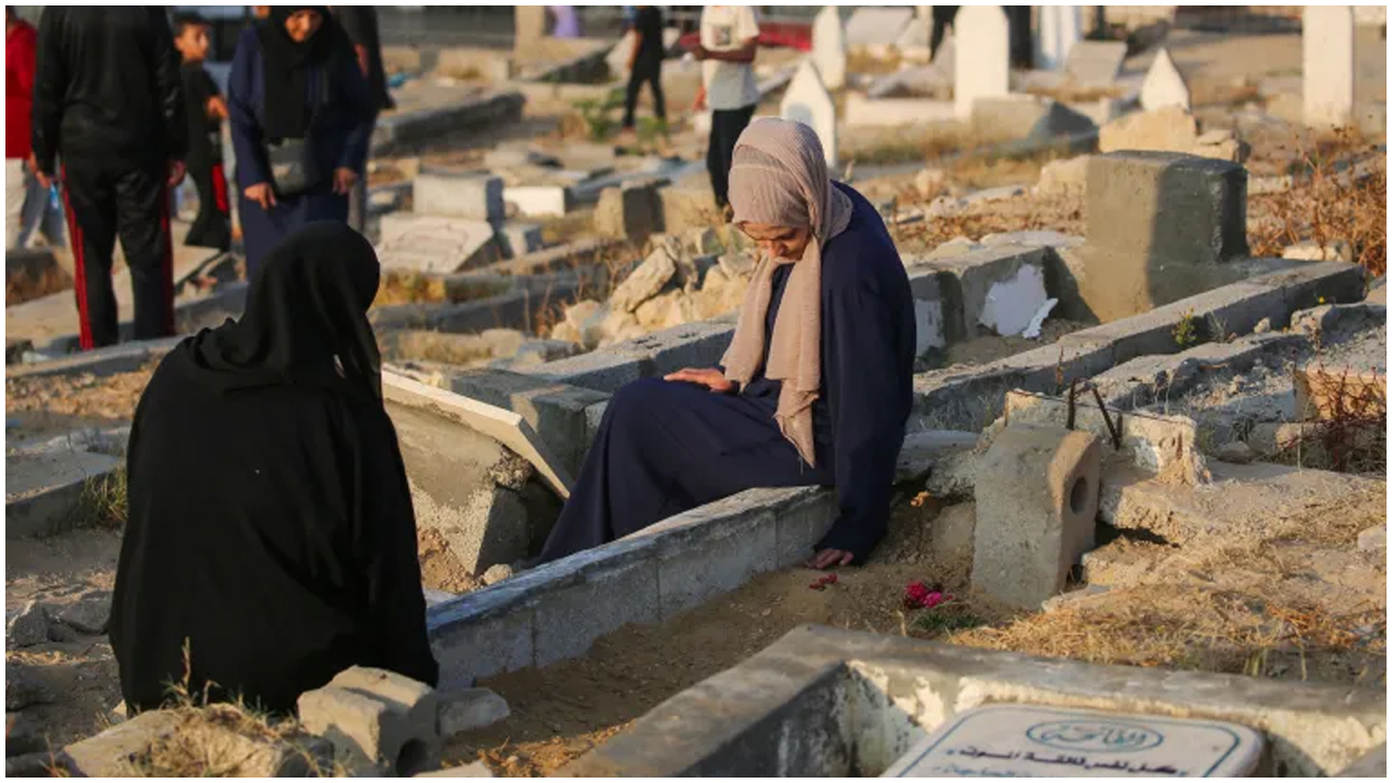 ঈদের দিন মৃত স্বজনদের কবরের পাশে ফিলিস্তিনের গাজা উপত্যকার দুই নারী -এএফপি/ ইয়াদ বাবা