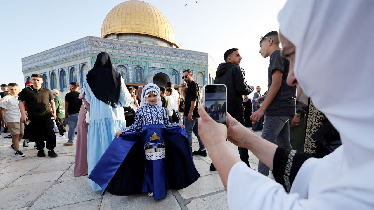 জেরুজালেমের আল-আকসা চত্বরে ঈদ সমাগম। ফিলিস্তিনের ঐতিহ্যবাহী পোশাকে ছবির জন্য পোজ দিচ্ছে শিশু