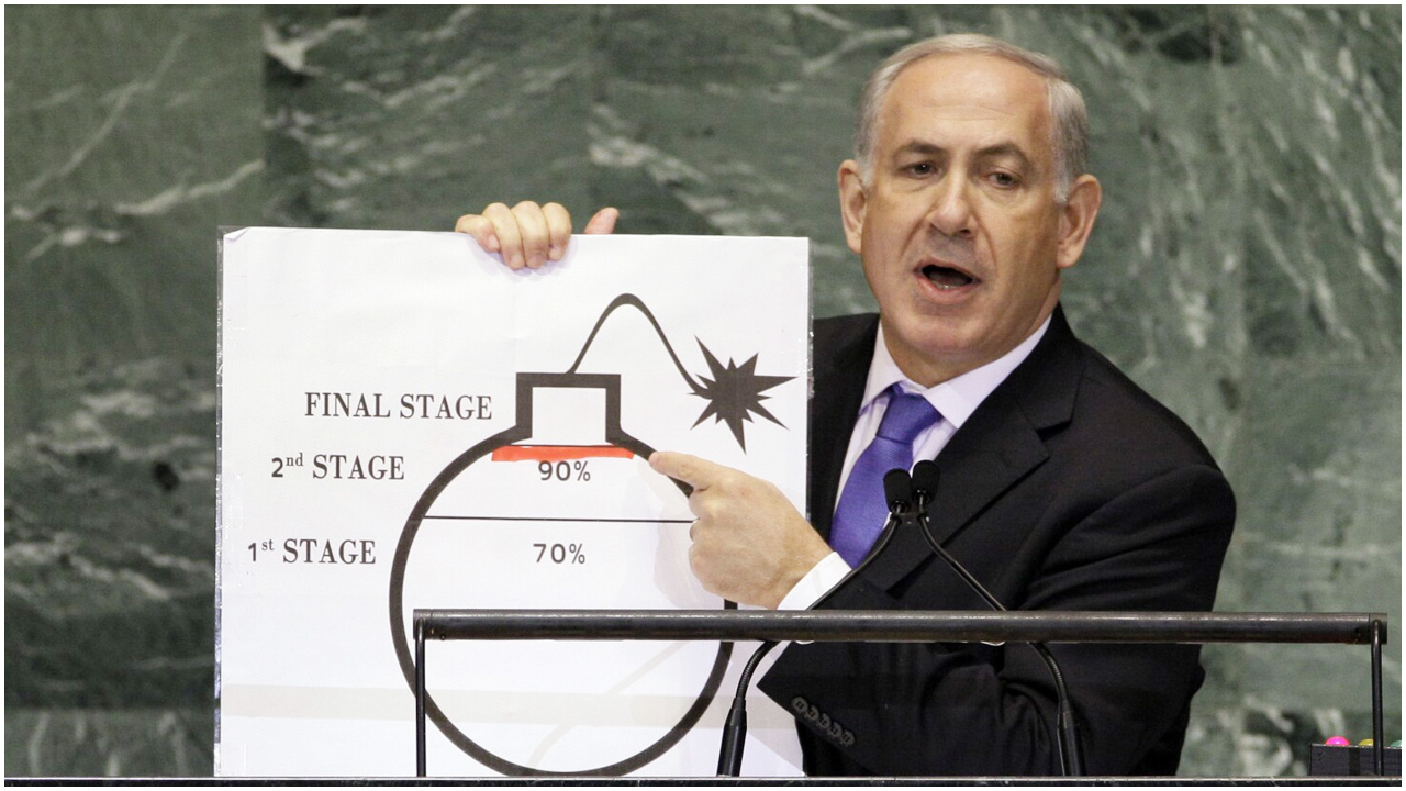 তবে এ নিয়ে সবচেয়ে পরিচিত দৃশ্যটি ২০১২ সালের সেপ্টেম্বরে যখন জাতিসংঘ সদর সাধারণ পরিষদের অধিবেশনে ভাষণ দেওয়ার সময় একটি বোমার কৃত্রিম ছবি নিয়ে যান। সেখানে তিনি বলেন, বর্তমান হারে চললে আগামী বসন্তের মধ্যে, সর্বোচ্চ আগামী গ্রীষ্মের মধ্যে, তারা মাঝামাঝি পর্যায়ে সমৃদ্ধকরণ শেষ করবে এবং চূড়ান্ত পর্যায়ে চলে যাবে।