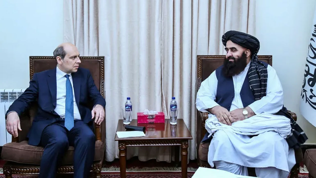 আফগানিস্তানে নিযুক্ত রাশিয়ার রাষ্ট্রদূত দিমিত্রি ঝিরনভ কাবুলে আফগান পররাষ্ট্রমন্ত্রী আমির খান মুত্তাকির সাথে বৈঠক করছেন। ছবিটি চলতি বছরের এপ্রিলে তোলা