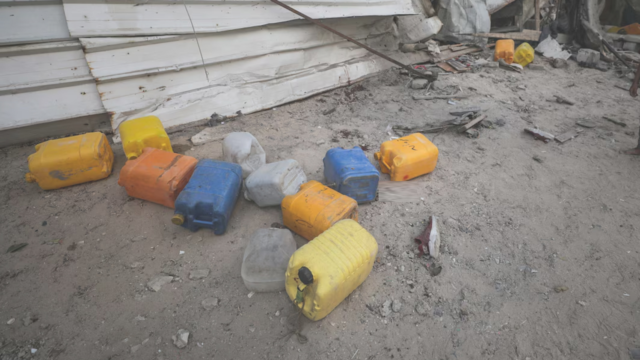 ইসরায়েলি হামলার পর পানির গ্যালনগুলো এভাবেই পড়ে ছিল।