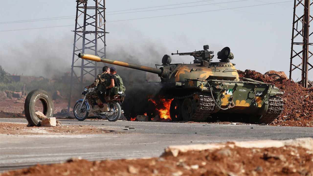 ইসরায়েলের হামলায় ক্ষতিগ্রস্ত ট্যাংকের পাশ দিয়ে যাচ্ছেন দুই সিরীয় সেনা।