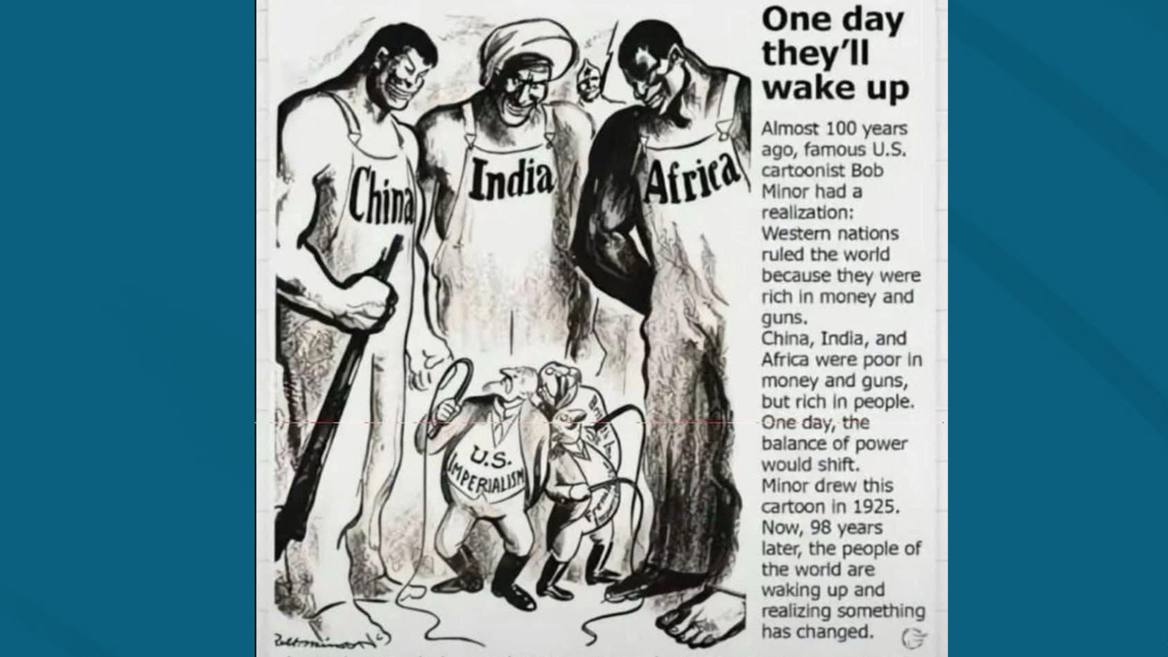 লিঙ্কডইনে কার্টুনটির ছবি গতকাল শুক্রবার (৮ আগস্ট) প্রকাশ করেন আর এল নারায়ণ নামে এক ব্যক্তি। ১৯২৫ সালে কার্টুনটি আঁকেন বব মাইনর। ওই সময় তিনি পশ্চিমাদের সাম্রাজ্যবাদের পতন এবং চীন, ভারত এবং আফ্রিকার উত্থানের ভবিষ্যদ্বাণী করেছিলেন। তিনি বুঝিয়েছিলেন, যুক্তরাষ্ট্র, যুক্তরাজ্য ও ফ্রান্সের প্রভাব কমে আসবে।