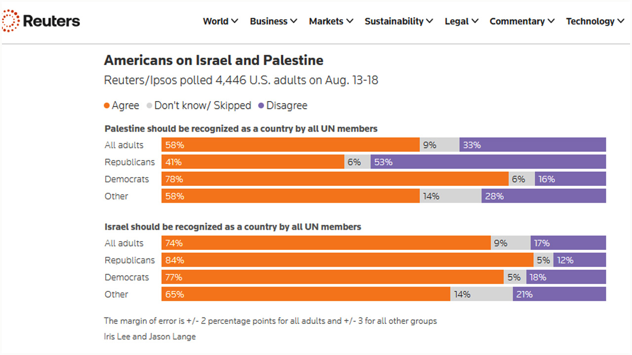 রয়টার্স/ইপসোসের নতুন জরিপ অনুযায়ী, জাতিসংঘের প্রতিটি সদস্যের ফিলিস্তিনকে রাষ্ট্র হিসেবে স্বীকৃতি দেওয়া উচিত বলে মনে করেন ৫৮ শতাংশ আমেরিকান। প্রায় দুই বছর ধরে চলা যুদ্ধে ইসরায়েল ও হামাসের সম্ভাব্য যুদ্ধবিরতি নিয়ে আলোচনার মাঝে জরিপের এই ফল প্রকাশ করা হয়েছে।