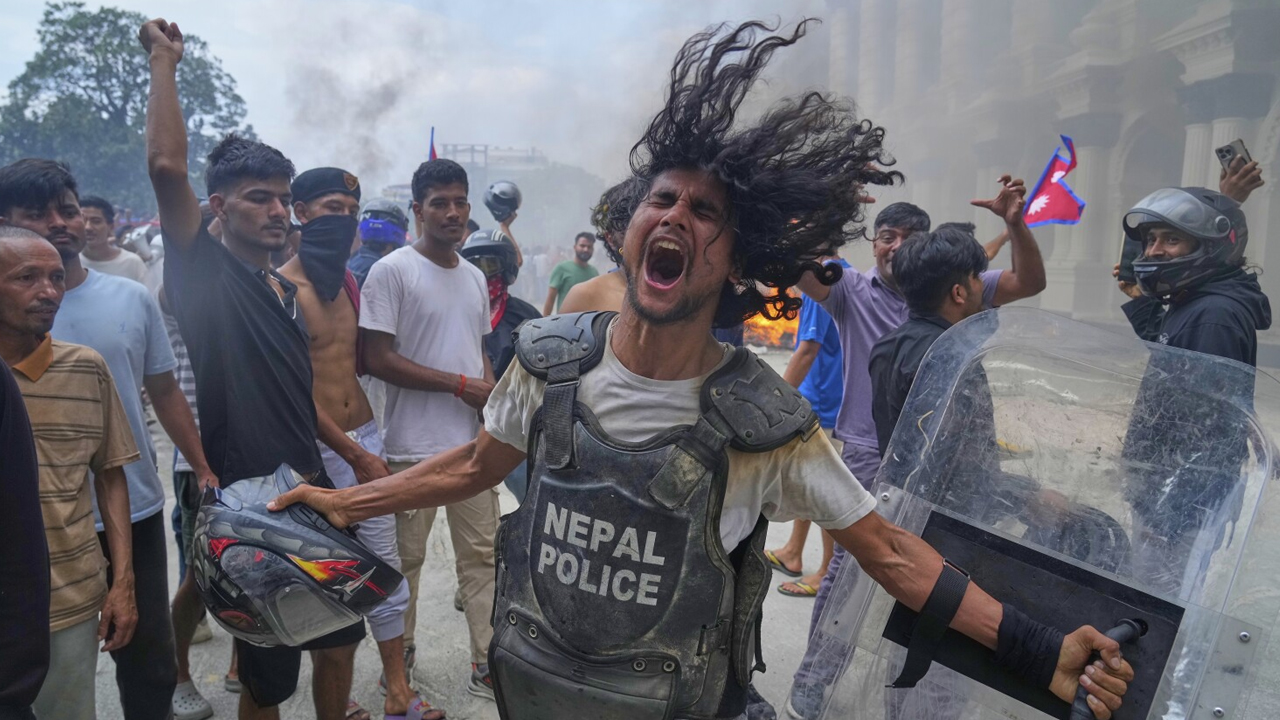 পুলিশের কাছ থেকে নিরাপত্তা সরঞ্জাম নিয়ে সেগুলো পরে আন্দোলনে নামেন নেপালের এক যুবক -এপি
