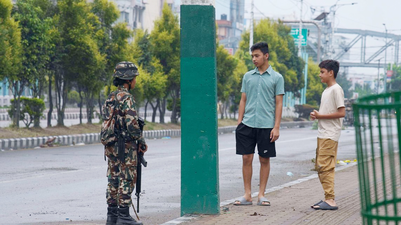 রাস্তায় পাহাড়া দিচ্ছেন নেপালের সেনাবাহিনীর এক নারী সদস্য। তার সঙ্গে কথা বলছেন দুজন তরুণ।
