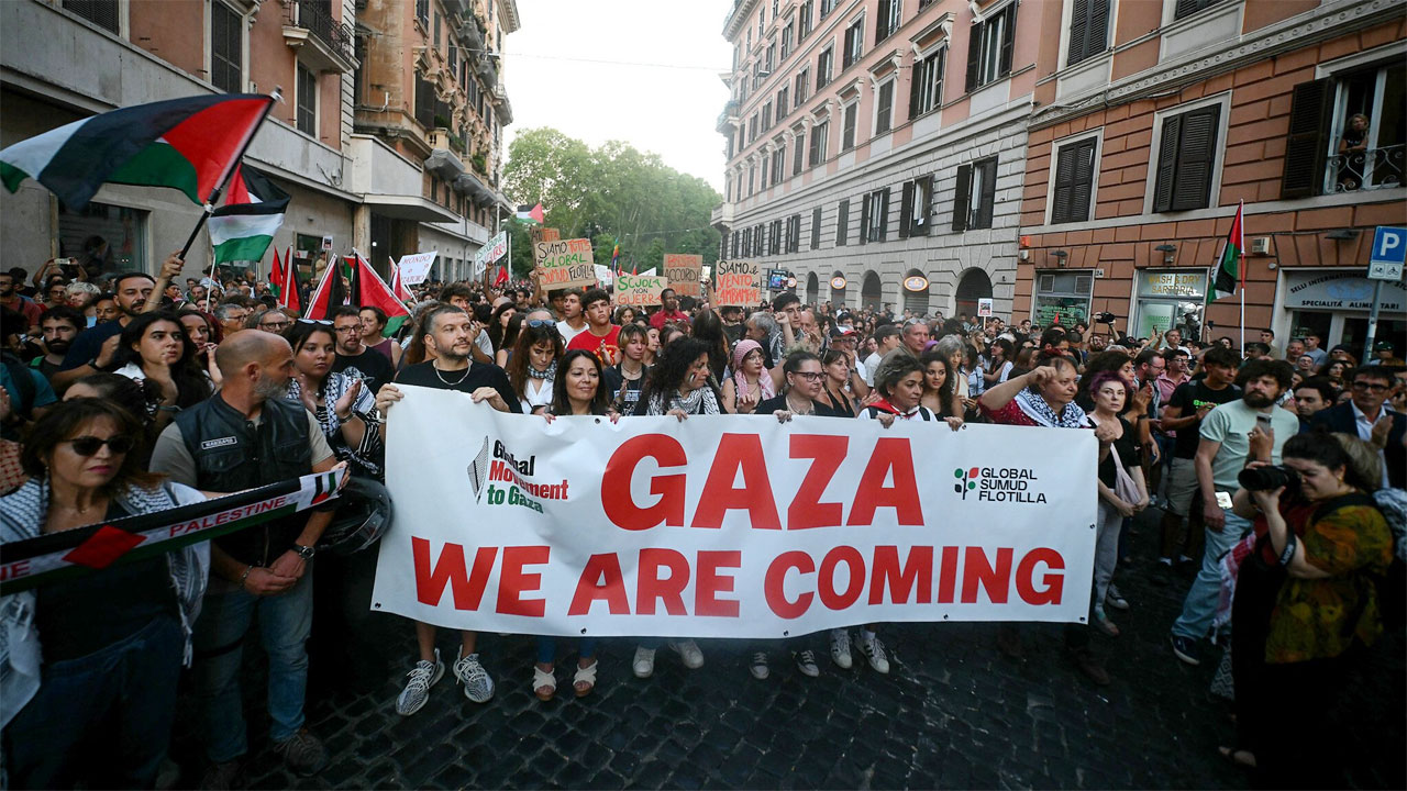 আন্তর্জাতিক সংবাদমাধ্যমে এ খবর প্রকাশিত হওয়ার কিছুক্ষণের মধ্যে ইতালির রাজধানী রোমের তেরমিনি স্টেশনের কাছে পিয়েজ্জা দেই কিনিকুয়েসেন্তো চত্বরে জড়ো হয়ে শত শত ফিলিস্তিনপন্থি আন্দোলনকারী নৌযানগুলো এবং ক্রু-যাত্রীদের ছেড়ে দেওয়ার দাবি জানান। এ সময় তারা তেরমিনি স্টেশনের সংলগ্ন ও আশপাশের সব সড়কে যান চলাচল বন্ধ করে দেন এবং স্লোগান দিতে থাকেন— ‘ফ্লোটিলা এবং ফিলিস্তিনের জন্য সবকিছু বন্ধ থাকবে।’