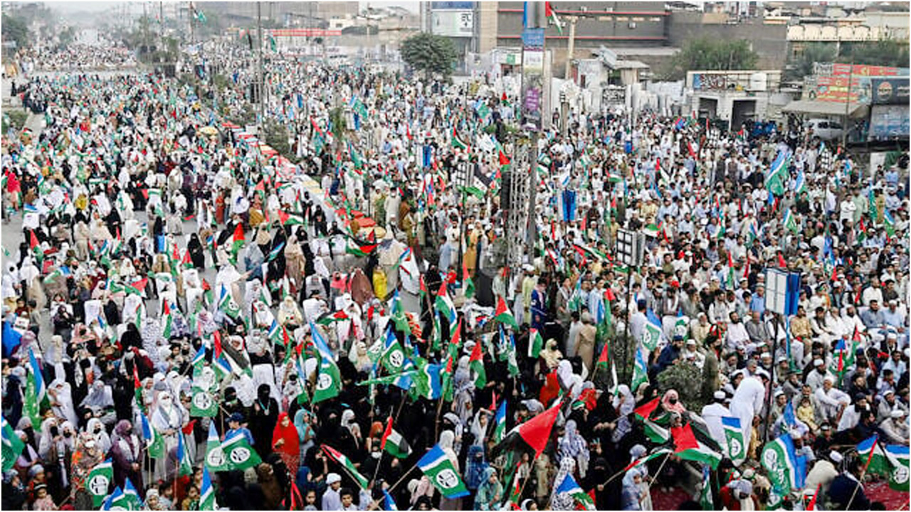 তিনি বলেন, আমাদের মিছিল ইসরায়েলের বর্বরতার বিরুদ্ধে। এর আগে দলটি পাকিস্তানজুড়ে ইসরায়েলি পণ্য বয়কটের ডাক দেয়। সোমবার হামাস যুদ্ধবিরতি চুক্তির অংশ হিসেবে শেষ ২০ জন জীবিত ইসরায়েলি জিম্মিকে মুক্তি দিয়েছে। ২০২৩ সালের ৭ অক্টোবর হামাসের হামলার পর শুরু হওয়া যুদ্ধের অবসানই এই যুদ্ধবিরতির লক্ষ্য।