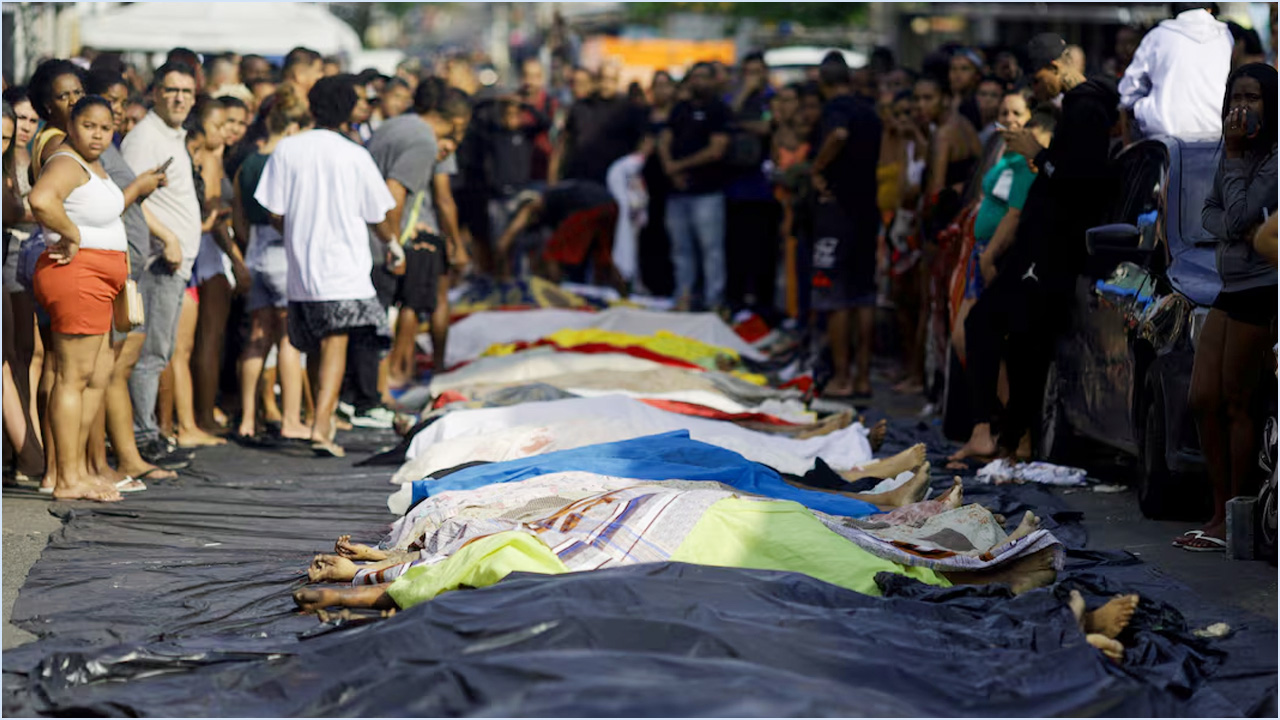 ব্রাজিলের রিও দে জেনেইরো রাজ্যের পেনহা ফাভেলা শহরে পুলিশের প্রাণঘাতী এক অভিযানের পর ৬০ জনেরও বেশি মানুষের মরদেহ পড়ে থাকতে দেখা গেছে। আইনশৃঙ্খলাবাহিনীর ব্যাপক পরিসরের অভিযানের একদিন পর সেখানকার একটি সড়কে এসব মরদেহ স্তূপ করে রাখা অবস্থায় পাওয়া গেছে।