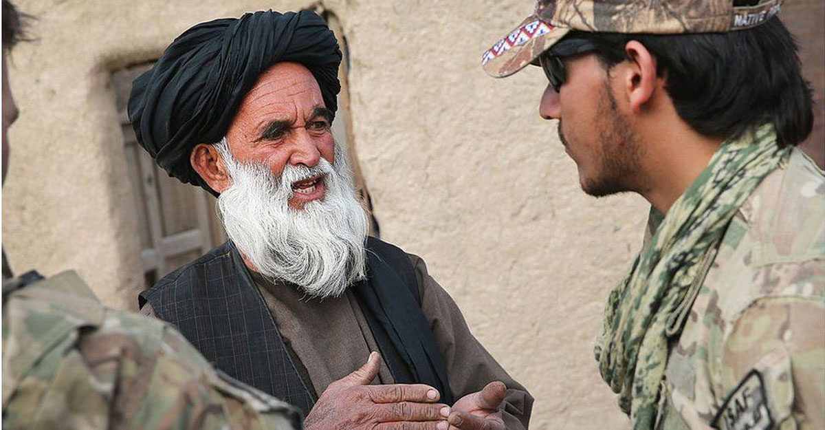 মার্কিন সামরিক বাহিনীর সঙ্গে থাকা একজন আফগান দোভাষী দেশটির এক গ্রামবাসীর সঙ্গে কথা বলছেন