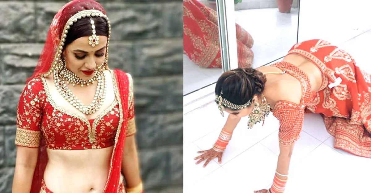 ভারী লেহেঙ্গা, গা ভরতি গহনা নিয়ে তিনি দিব্যি দিয়ে গেলেন পুশআপ।