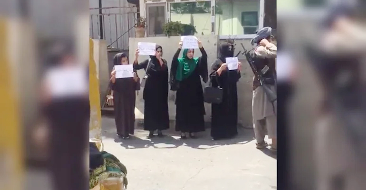 সেই ভিডিওতে দেখা যাচ্ছে, কাগজে হাতে লেখা প্রতিবাদী বক্তব্য নিয়ে চারজন নারী কাবুলের সড়কে দাঁড়িয়ে আছেন, অল্প দূরত্বে তাদের ঘিরে দাঁড়িয়ে আছে কয়েকজন সশস্ত্র তালেবান সদস্য।