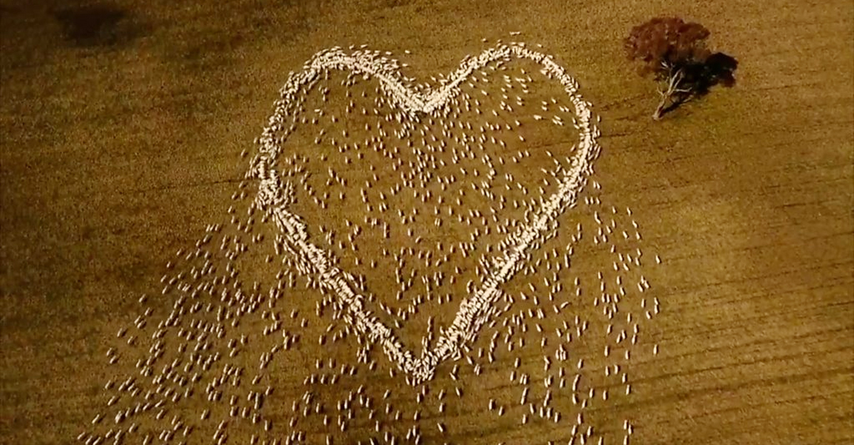 ভাইরাল হওয়া সেই ছবিতে দেখা যাচ্ছে কয়েক হাজার ভেড়া জড়ো হয়ে সেই শস্যদানা খাচ্ছে, উপর থেকে তাদের সেই জড়ো হওয়ার আকৃতি অনেকটা হৃদয়ের মতো।