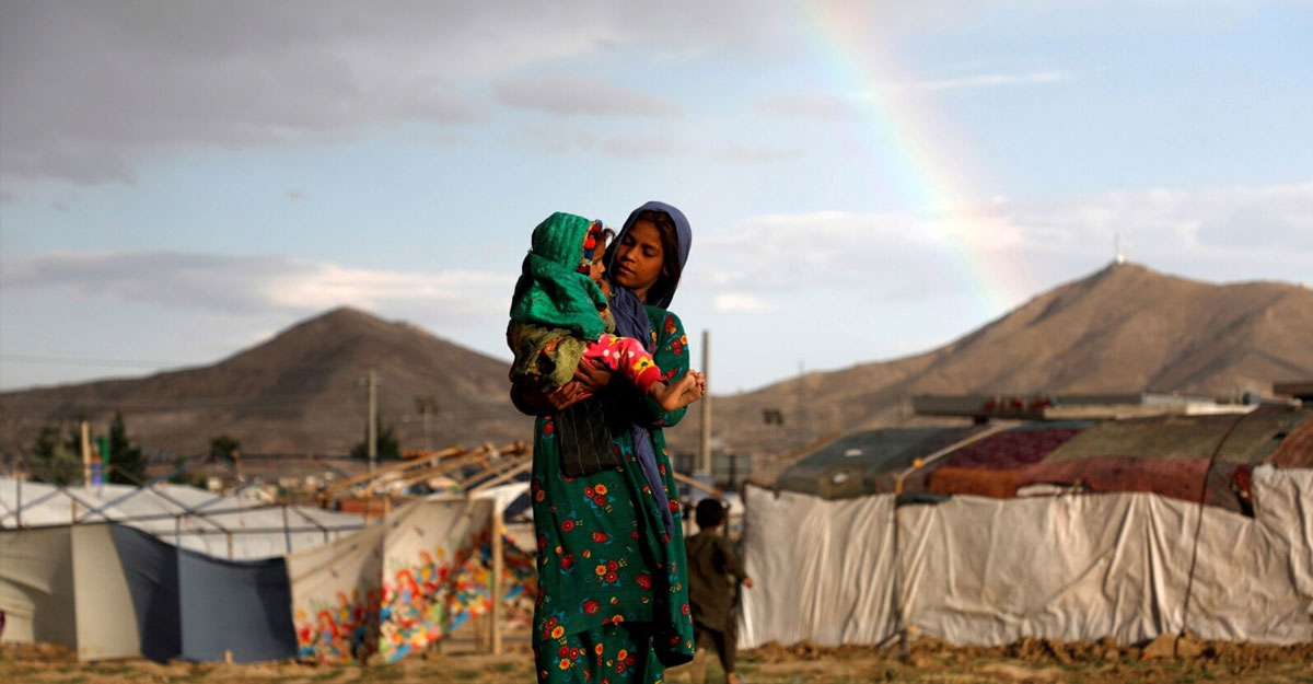 অভ্যন্তরীণভাবে বাস্তুচ্যুত এক আফগান নারী দেশটির রাজধানী কাবুলের কাছে একটি শরণার্থী শিবিরে এক শিশুকে কোলে নিয়ে আছে। ২০১৯ সালের ছবি