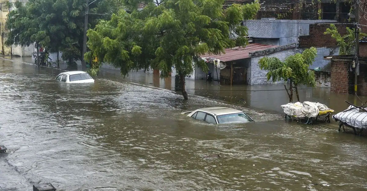 প্রবল বৃষ্টিপাতের পর উত্তরপ্রদেশের রাজধানী লখনৌর অনেক রাস্তায় পানি জমে যায়। বৃহস্পতিবারের ছবি