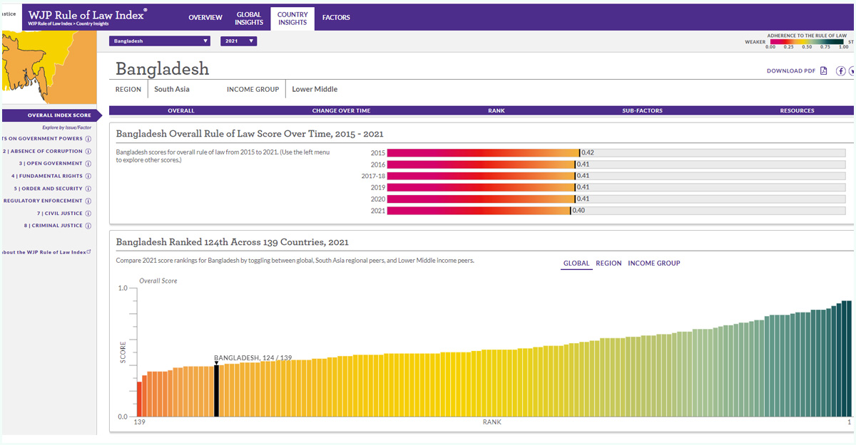বিশ্বের ১৩৯টি দেশের আইনশৃঙ্খলা পরিস্থিতি জরিপকারী আন্তর্জাতিক সংগঠন ওয়ার্ল্ড জাস্টিস প্রোজেক্টের (ডব্লিউজেপি) ২০২১ সালের সূচকে এই তথ্য জানানো হয়েছে।