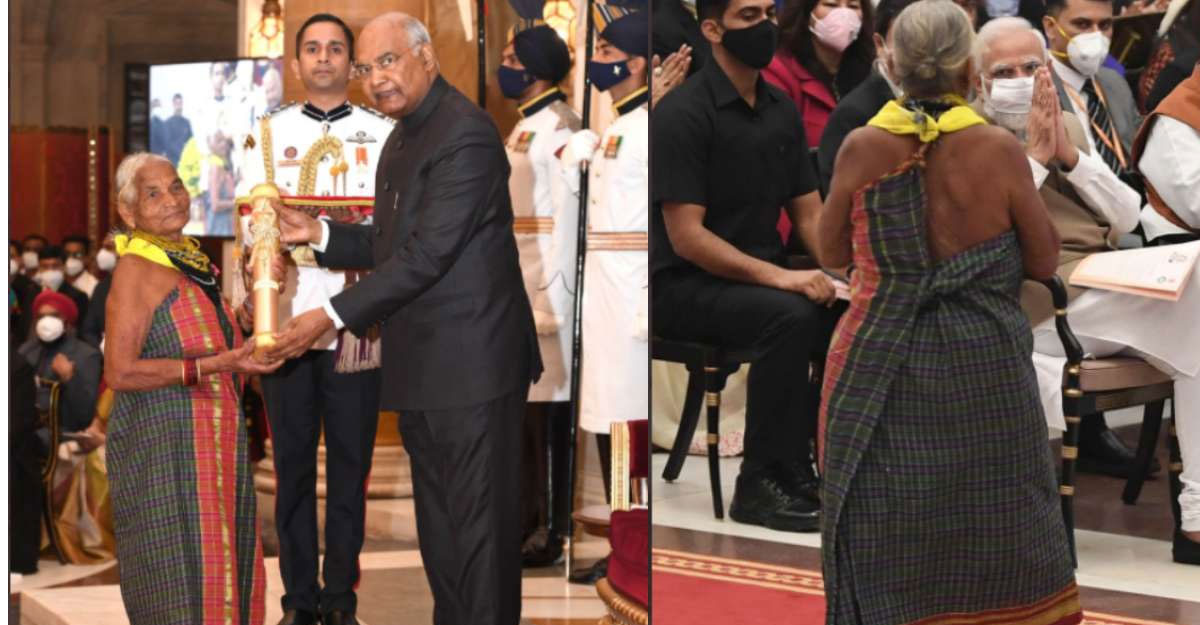সোমবার ভারতের রাষ্ট্রপতি ভবনের লাল কার্পেটে ওই নারীকে দেখা যায় প্রচলিত ধারার বাইরে গিয়ে খালি পায়ে হেঁটে আসতে। শুধু তাই নয় সত্তরোর্ধ্ব নারীর পরনেও ছিল খাটো শাড়ি। ভারতের রাষ্ট্রপতি রামনাথ কোবিন্দ, প্রধানমন্ত্রী নরেন্দ্র মোদিসহ উপস্থিত বিশিষ্টদের ভিড়ে সহজেই নজর কেড়ে নিয়েছেন এই বৃদ্ধা।