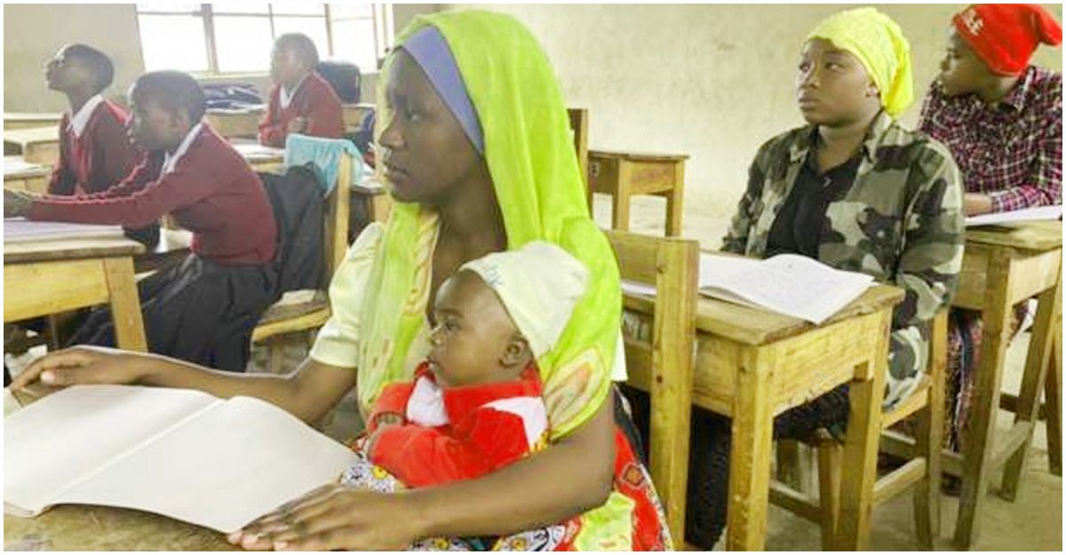 অন্তঃসত্ত্বা স্কুলছাত্রীদের ওপর আরোপিত নিষেধাজ্ঞা বাতিলের নতুন আদেশ জারি হওয়ার পর তানজানিয়ার এক স্কুলছাত্রী তার সন্তানকে নিয়ে ক্লাসে ফিরেছেন।