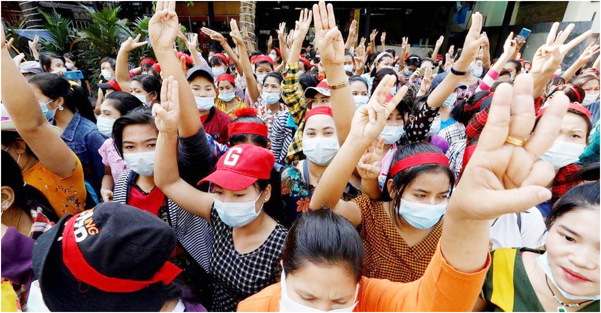ইয়াঙ্গুনে স্বৈরশাসনবিরোধী বিক্ষোভের সময় প্রতিবাদকারীরা তিন আঙুল উঁচিয়ে অং সান সু চিকে স্যালুট জানান/ ছবি: এএফপি