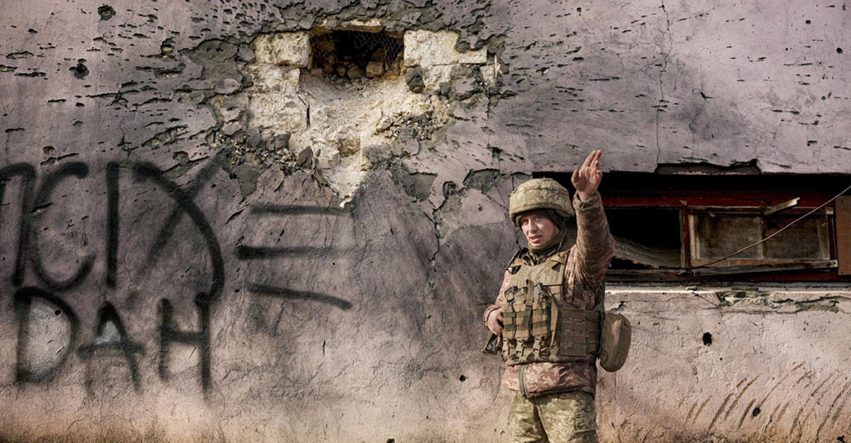 রুশ সমর্থিত বিচ্ছিন্নতাবাদীদের হামলায় ক্ষতিগ্রস্ত পূর্ব ইউক্রেনের লুহানস্ক এলাকার একটি ভবনের সামনে ইউক্রেনের এক সেনা। ছবিটি শনিবার (১৯ ফেব্রুয়ারি) তোলা