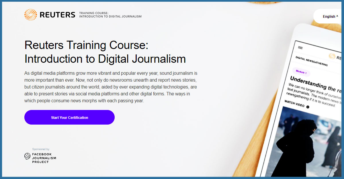 ‘রয়টার্স ডিজিটাল জার্নালিজম কোর্স’ শীর্ষক একটি অনলাইন প্রশিক্ষণ শুরু করছে ফেসবুক জার্নালিজম প্রজেক্ট ও রয়টার্স। ডিজিটাল রিপোর্টিং ও এডিটিং বিষয়ে বাংলাদেশসহ এশিয়া প্যাসিফিকের নয়টি দেশের সাংবাদিকদের জন্য চালু করা হয়েছে এই প্রোগ্রামটি।