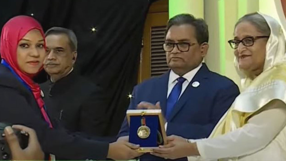 রোববার (১৮ ডিসেম্বর) সুপ্রিম কোর্টের সুবর্ণজয়ন্তী উপলক্ষে বঙ্গবন্ধু আন্তর্জাতিক সম্মেলন কেন্দ্রে এক আলোচনা অনুষ্ঠানে প্রধানমন্ত্রী শেখ হাসিনার হাত থেকে স্বর্ণপদক গ্রহণ করেন পদকপ্রাপ্তরা।