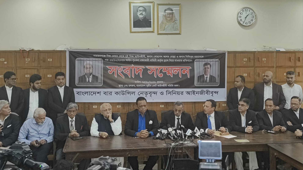 বুধবার (২৫ অক্টোবর) এক সংবাদ সম্মেলনে নারায়ণগঞ্জে নিজ চেম্বার থেকে বিএনপিপন্থি দুই আইনজীবীকে তুলে নিয়ে যাওয়ার ঘটনার প্রতিবাদে এমন দাবি জানান তারা।