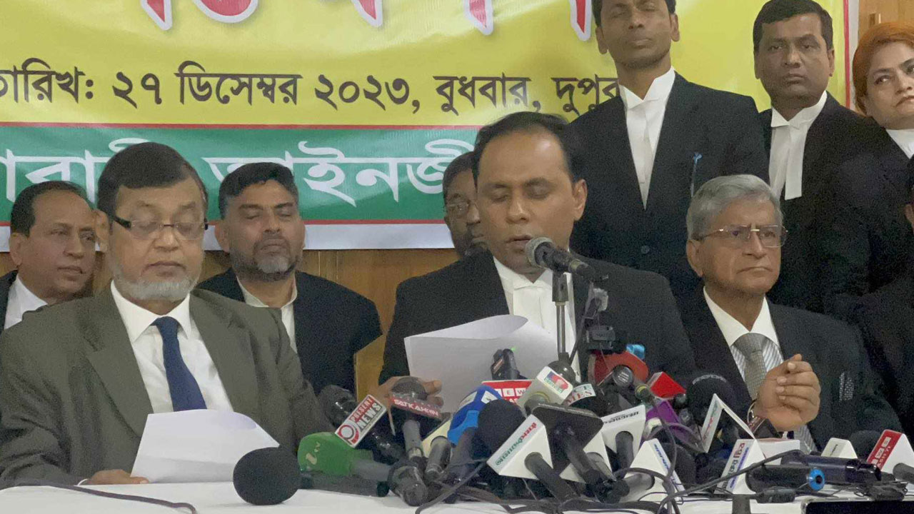 সংবাদ সম্মেলনে লিখিত বক্তব্য পাঠ করেন ব্যারিস্টার কায়সার কামাল।