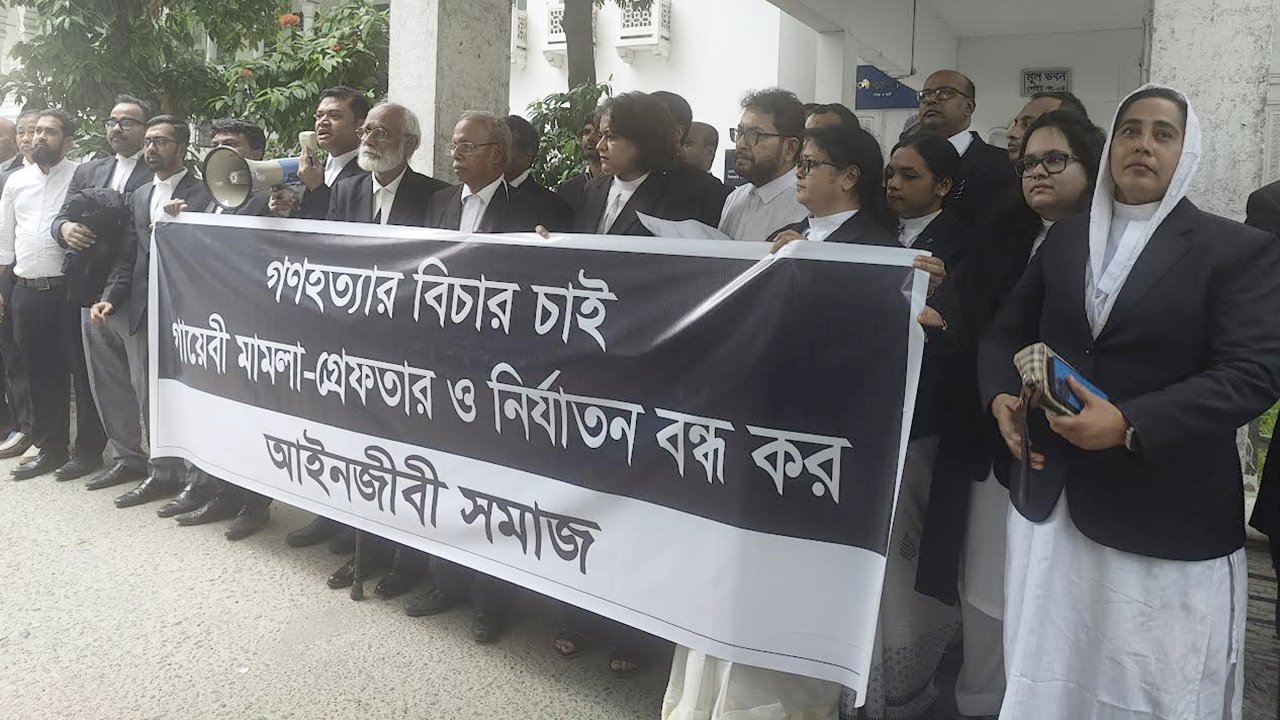 সোমবার সুপ্রিম কোর্ট প্রাঙ্গণে অনুষ্ঠিত মানববন্ধন থেকে তারা এসব কথা বলেন। ‘আইনজীবী সমাজ’র ব্যানারে এ মানববন্ধন অনুষ্ঠিত হয়। ব্যানারে লেখা ছিল ‘গণহত্যার বিচার চাই, গায়েবি মামলা-গ্রেপ্তার ও নির্যাতন বন্ধ কর’।