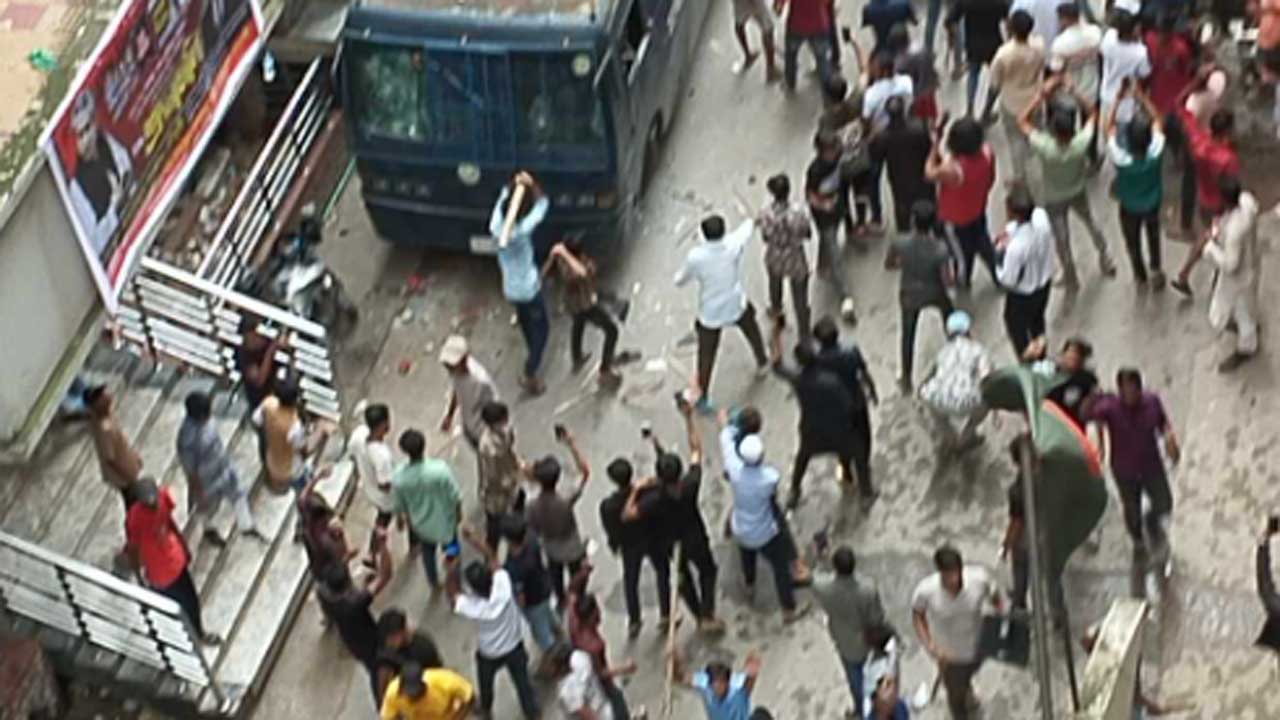 রোববার (৪ আগস্ট) বেলা ১১টা ৫০ মিনিটের দিকে তারা ভেতরে প্রবেশ করে হামলা শুরু তরেন। এসময় তারা লাঠিসোঁটা, ইটপাটকেল নিক্ষেপ করে পুলিশের বেশ কয়েকটি গাড়ি ভাঙচুর করেন। পরিস্থিতি নিয়ন্ত্রণে পুলিশ টিয়ারশেল ও সাউন্ড গ্রেনেড নিক্ষেপ করে।