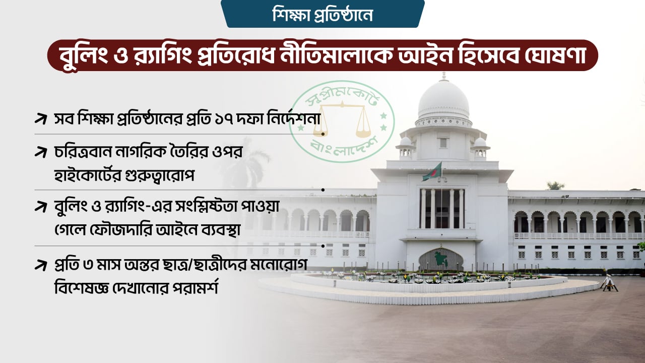 প্রতিষ্ঠানে বুলিং ও র্যাগিং প্রতিরোধ সংক্রান্ত নীতিমালা-২০২৩ কে আইন হিসেবে ঘোষণা করেছেন হাইকোর্ট। একইসঙ্গে শিক্ষাপ্রতিষ্ঠানে বুলিং ও র্যাগিং প্রতিরোধে ১৭ দফা নির্দেশনা দিয়েছেন উচ্চ আদালত।