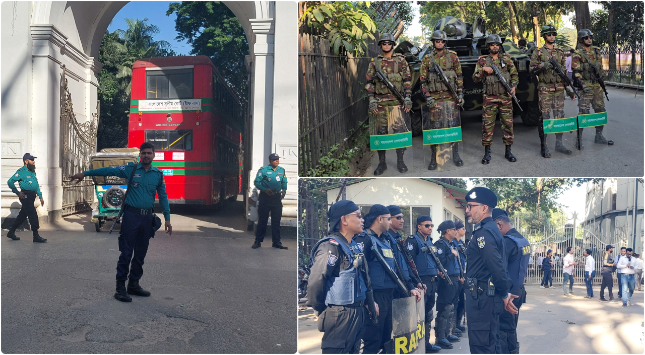 ক্ষমতাচ্যুত সাবেক প্রধানমন্ত্রী শেখ হাসিনাসহ তিনজনের বিরুদ্ধে দায়ের হওয়া মানবতাবিরোধী অপরাধের মামলার রায়কে কেন্দ্র করে আজ সকাল থেকেই আন্তর্জাতিক অপরাধ ট্রাইব্যুনাল ও সুপ্রিম কোর্ট এলাকা কঠোর নিরাপত্তার বলয়ে ঘিরে ফেলা হয়েছে। চার বাহিনীর সদস্যরা (সেনাবাহিনী, পুলিশ, বিজিবি ও র্যাব) আদালতপাড়ার গুরুত্বপূর্ণ প্রবেশমুখে কড়া অবস্থান নিয়েছে। কোথাও সামান্য সন্দেহ হলেই পথচারীকে থামিয়ে জিজ্ঞাসাবাদ করা হচ্ছে, দেখা হচ্ছে পরিচয়পত্র ও ব্যাগপত্র।