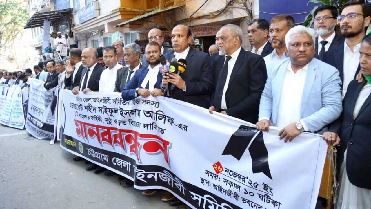 চট্টগ্রামের আইনজীবী সাইফুল ইসলাম আলিফ হত্যাকাণ্ডে জড়িত পলাতক আসামিদের গ্রেপ্তার এবং দ্রুত বিচার নিশ্চিত করার দাবিতে মানববন্ধন করেছেন আইনজীবীরা।