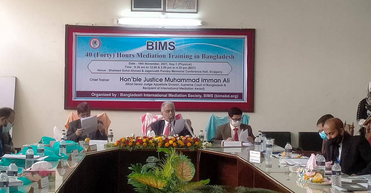 শুক্রবার (১৯ নভেম্বর) সিরাজগঞ্জ জজ কোর্ট মিলনায়তনে বিচারক ও প্যানেল মেডিয়েটরদের নিয়ে ৪০ ঘণ্টাব্যাপী প্রশিক্ষণ কর্মশালার উদ্বোধনী অনুষ্ঠানে তিনি এসব কথা বলেন। বাংলাদেশ ইন্টারন্যাশনাল মেডিয়েশন সোসাইটি (বিমস) এ প্রশিক্ষণ কর্মশালার আয়োজন করেছে।